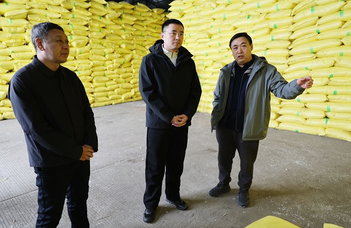 在展囤粮食贸易有限公司,赵尉凯实地查看企业运营管理、产品销售、发展规划等情况。他强调,相关部门要切实增强服务意识,积极主动靠前服务,助力企业做大做强。企业要落实质量安全主体责任,严把农资原料、生产、存储、销售等环节质量关。相关部门要从严规范农资市场秩序,加密督导检查频次,严打制售假劣化肥、农药、种子行为,筑牢备春耕生产质量安全防线。